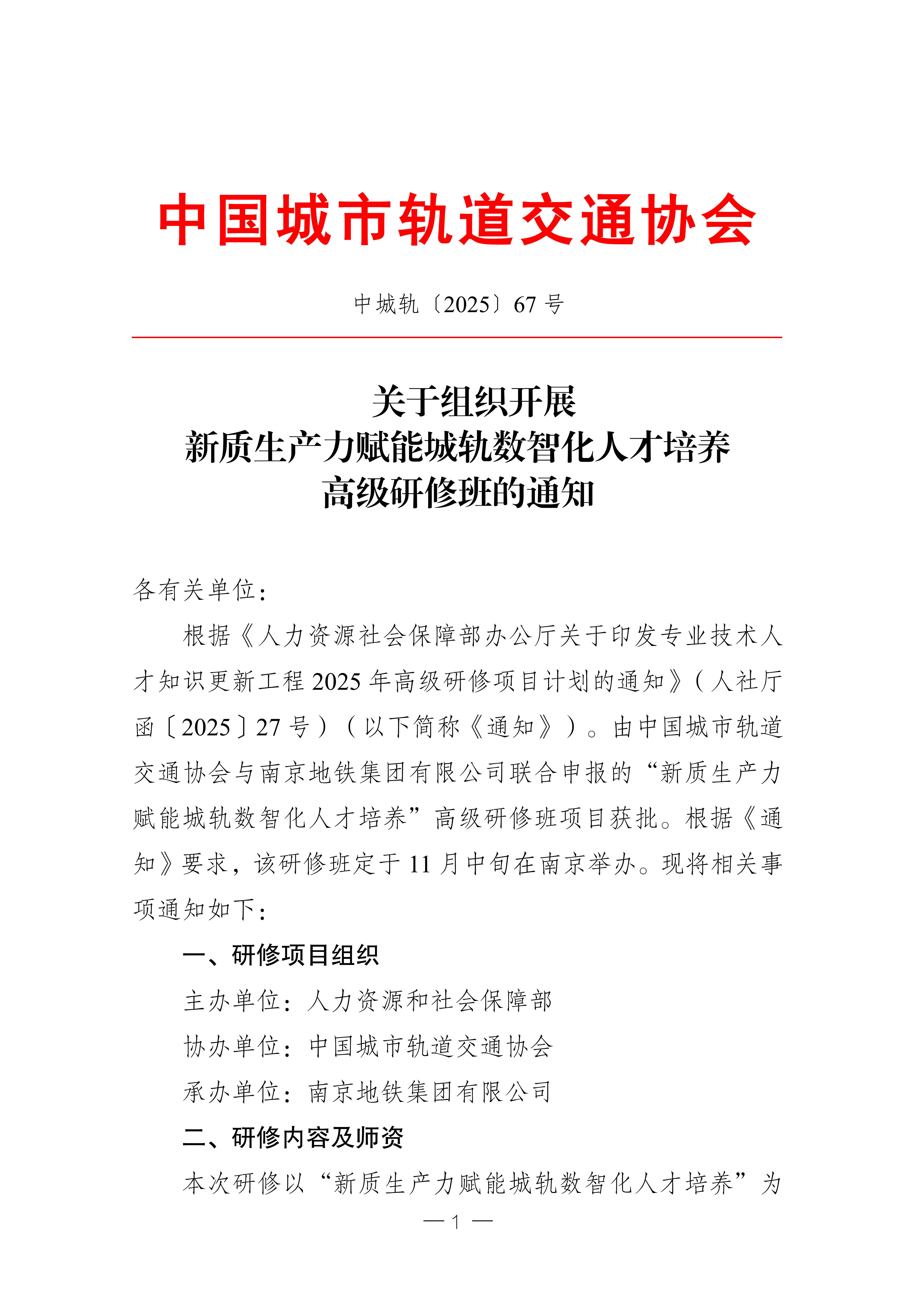 根据《人力资源社会保障部办公厅关于印发专业技术人才知识更新工程2025年高级研修项目计划的通知》(人社厅函〔2025〕27号)(以下简称《通知》),由中国城市轨道交通协会申报的“新质生产力赋能城轨数智化人才培养”高级研修班项目获批。高研班是由人力资源和社会保障部主办、中国城市轨道交通协会协办、南京地铁集团有限公司承办的国家级公益性培训项目。